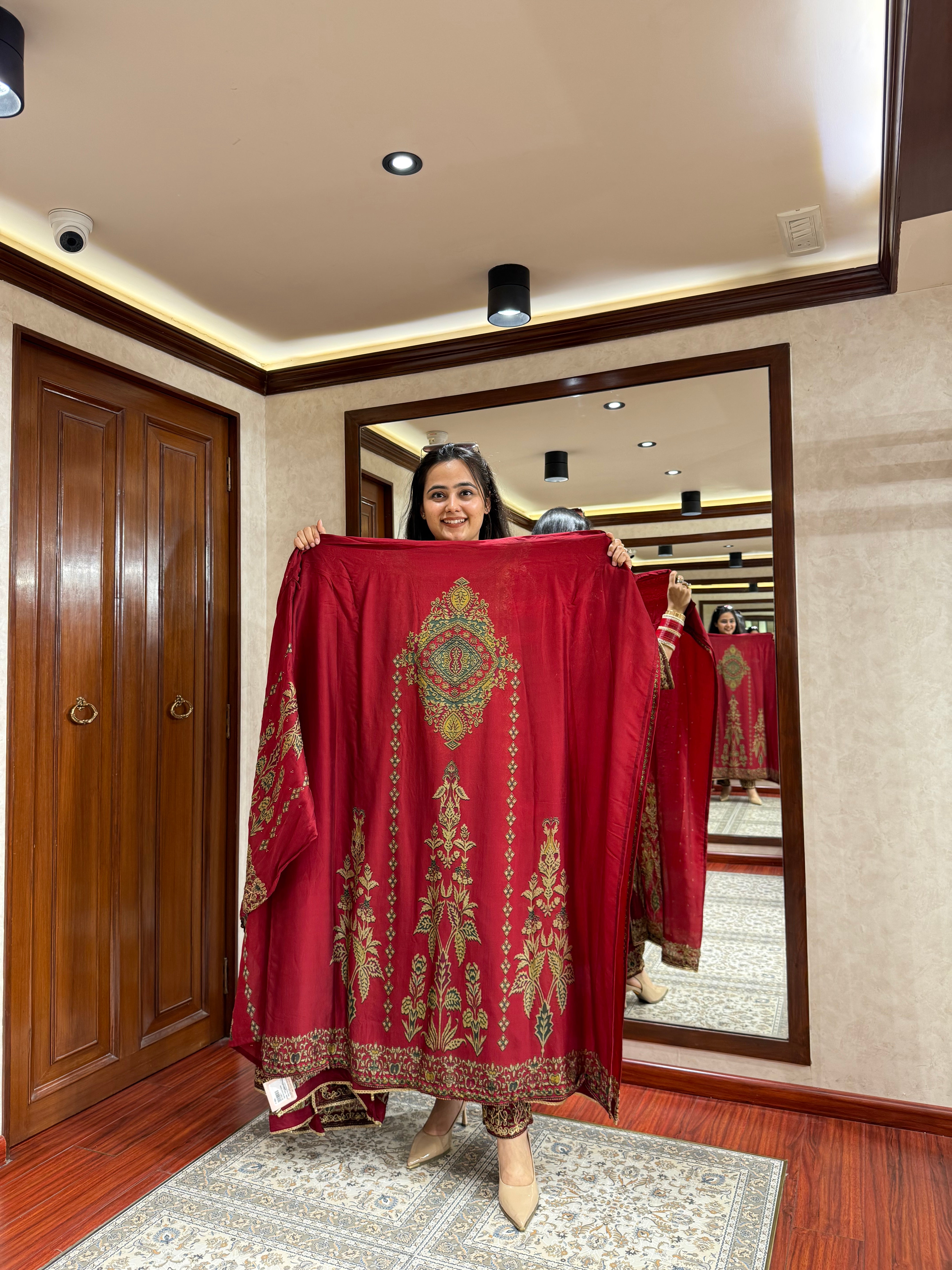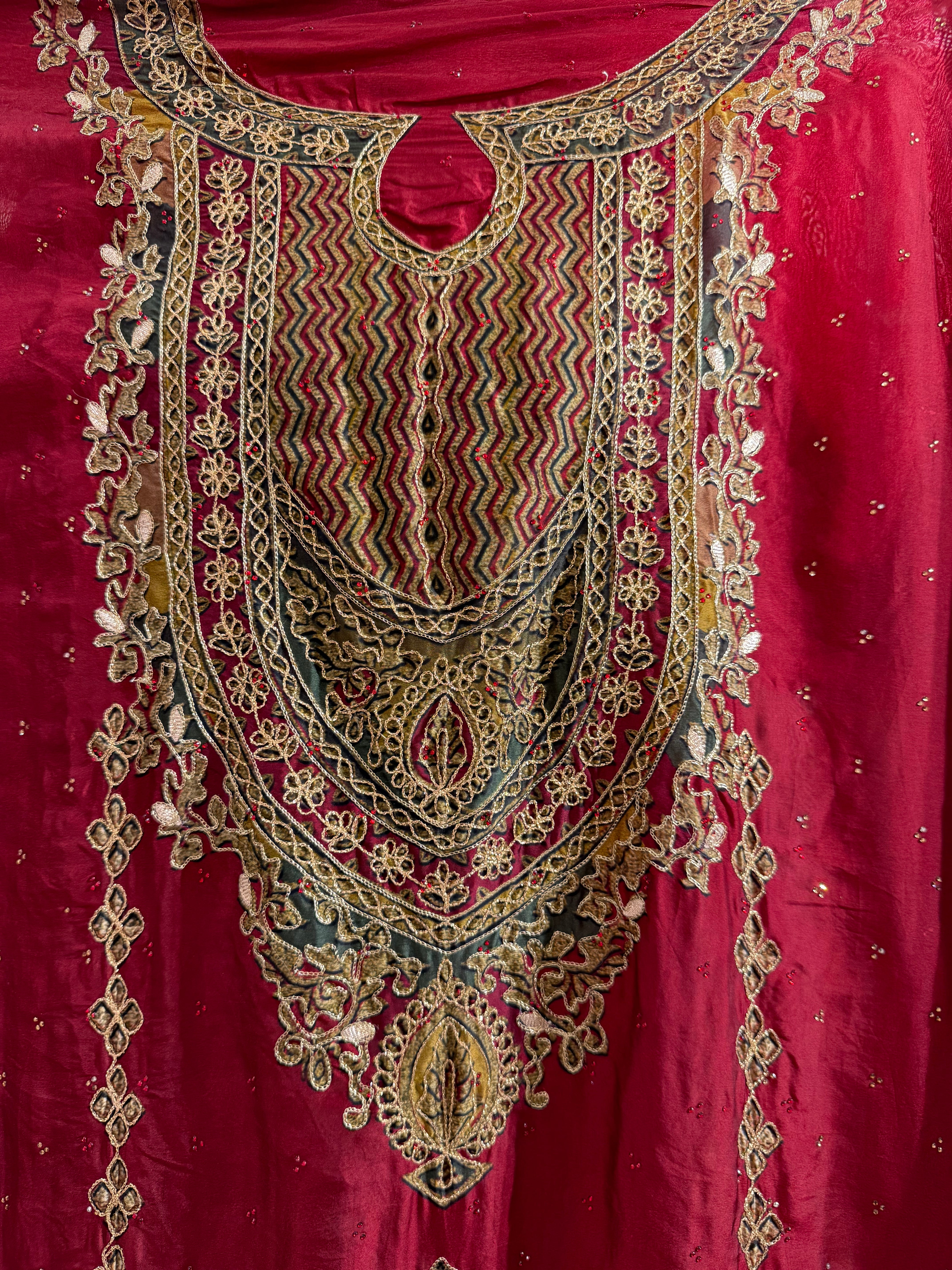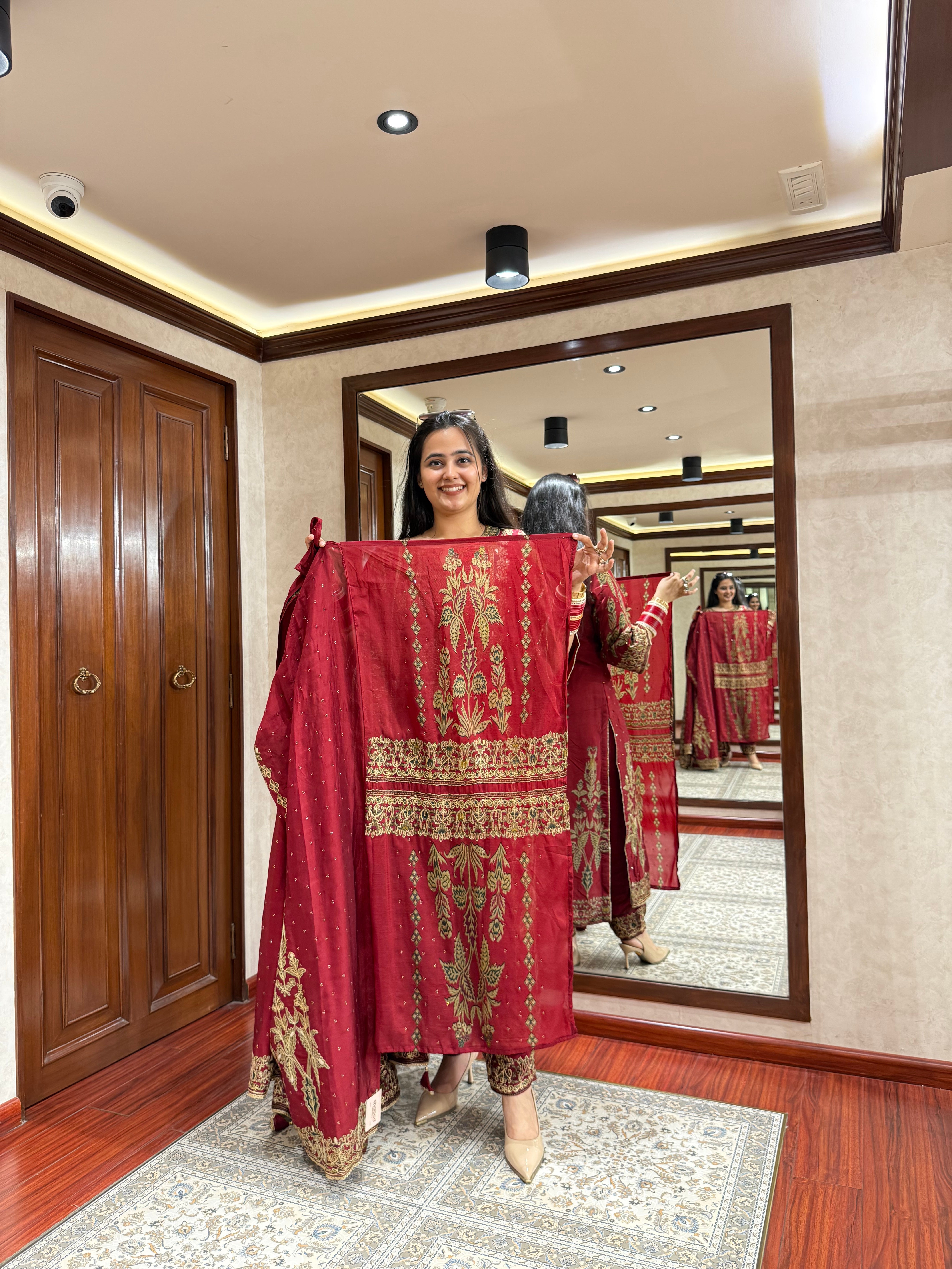 Viral Red Suit On Soft Organza Crape(Unstitched)